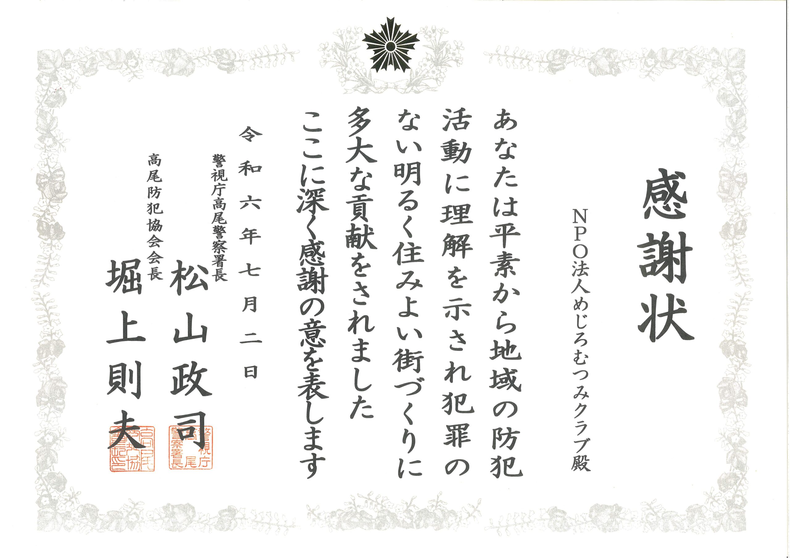 7月2日 高尾警察署長と高尾防犯協会長連名の感謝状をいただきました。