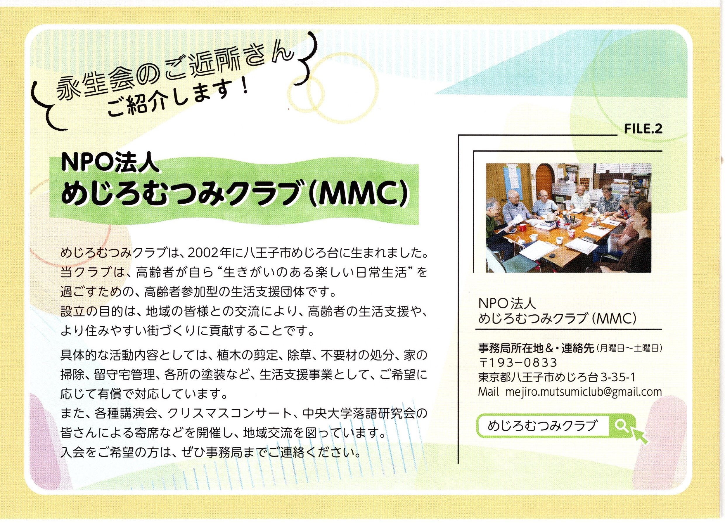 永生会の広報誌にMMCが紹介されました! 2024 11/24 お知らせ 2024年11月21日2024年11月24日 安藤永生会理事長はMMCの理事でもいらっしゃり、イベントや総会などの会議には理事長やスタッフの方が参加され活動を支えてくださっています。 お知らせ よかったらシェアしてね! URLをコピーしました! URLをコピーしました! 11月4日、二丁目防災訓練で軽トラ運行し告知活動! 12月14日クリスマスコンサート 演奏者のプロフィール紹介